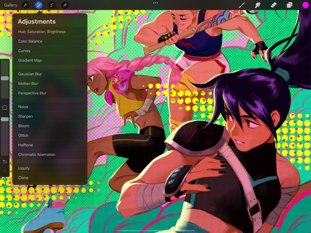 Procreate dedicates the top half of the menu to color adjustments. These four versatile, professional tools adjust and balance the colors in your image.