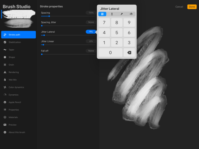 Every slider in Brush Studio can also be adjusted numerically for greater control. Tap the numerical value of a slider to open the advanced brush settings and type in the precise number you need, or Scribble in your values using Apple Pencil. See more about Advanced Brush Settings below.
