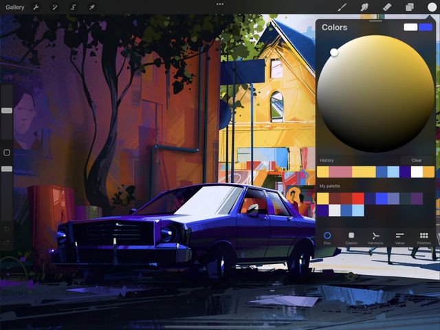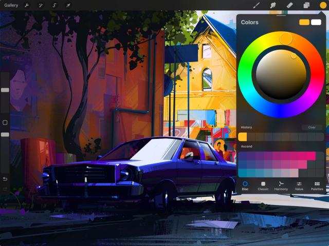 On the right-fathand side of the top menu, you’ll see the Active Color. Tap it to open the Color Panel. By default, the Color Panel shows Procreate’s Color Disc.