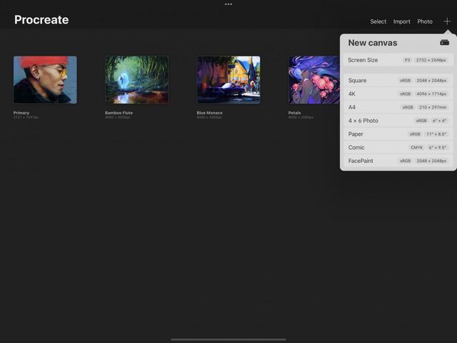 In the New canvas menu, you’ll see a list of preset canvases. These templates include Screen Size, Square, high-resolution 4K, A4 paper, 4 x 6 Photo, and US Paper.
