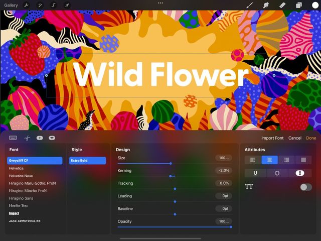 Add new Text to your canvas and style the font. Double-tap the Text to invoke the Text Entry Companion. Tap the name of the font in the Text Entry Companion to invoke the Edit Style panel.