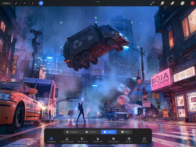 Tap the Distort button in the Transform toolbar. Drag any corner node to begin your transformation.